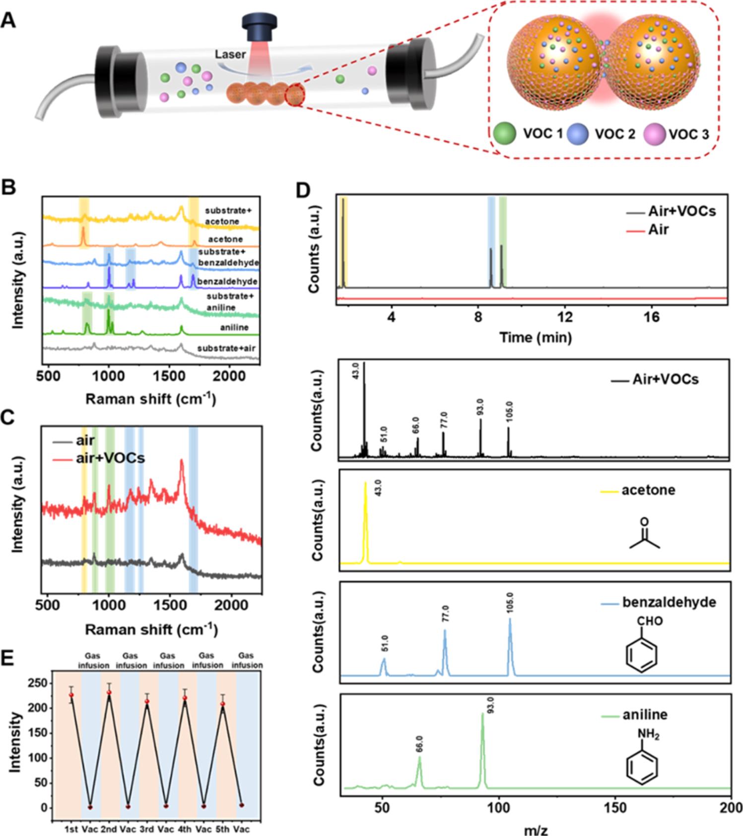 圖3(A) 使用Au@COF納米傳感器吸附、檢測揮發(fā)性有機物示意圖。(B) 空氣和單個揮發(fā)性有機物的拉曼光譜。(C) 空氣和各種揮發(fā)性有機物的拉曼光譜。(D) 空氣和揮發(fā)性有機物的GC−MS光譜以及單個揮發(fā)性有機物標準樣品的MS光譜。(E)Au@COF納米傳感器可回收性
