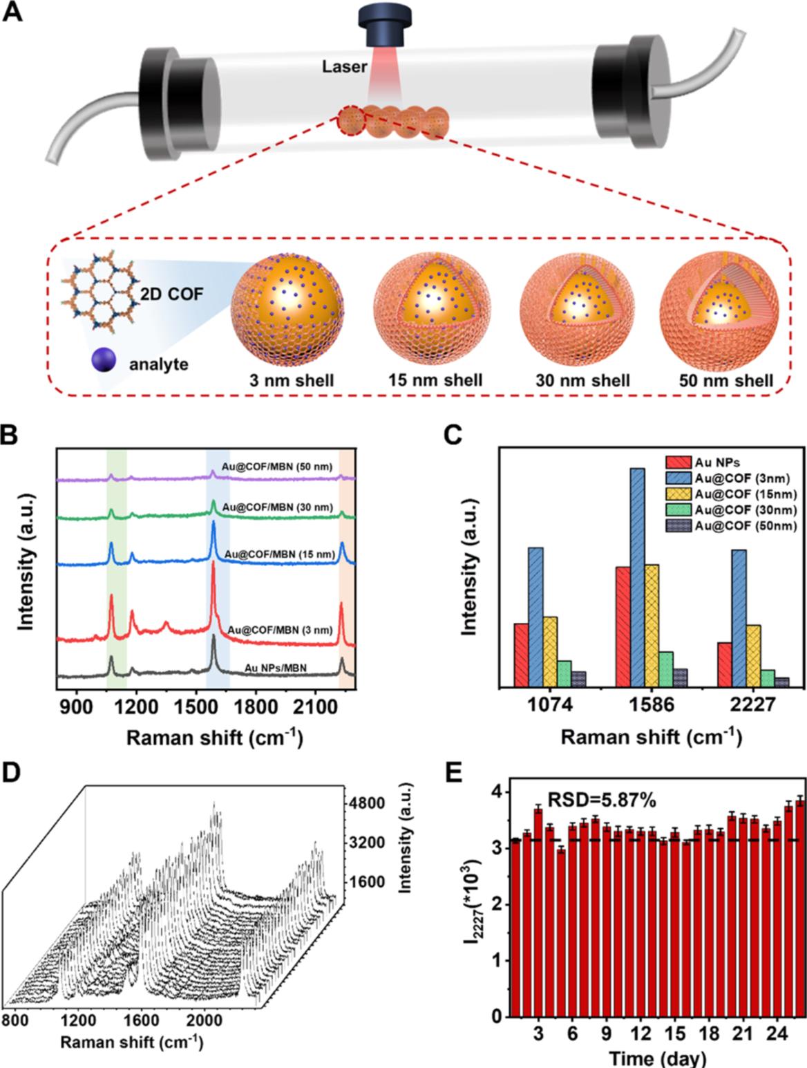 圖2(A)具有不同殼層厚度(3−50 nm)Au@COF的PERS性能示意圖。(B)MBN孵育不同Au@COF殼厚度的PERS 光譜圖。(C) 不同殼厚度的Au@COF在1074,1586和2227 cm-1處的峰強。(D) MBN孵育后PERS光譜隨時間的變化關(guān)系。(E) MBN孵育后2227 cm−1處PERS峰值強度隨時間變化的統(tǒng)計數(shù)據(jù)