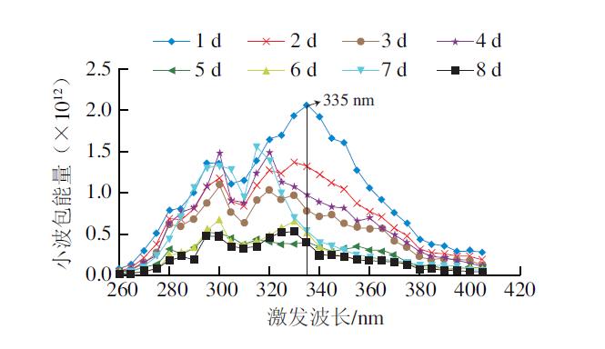 圖3 不同貯藏日特征激發(fā)波長下發(fā)射光譜小波包分解*低頻段能量總和變化