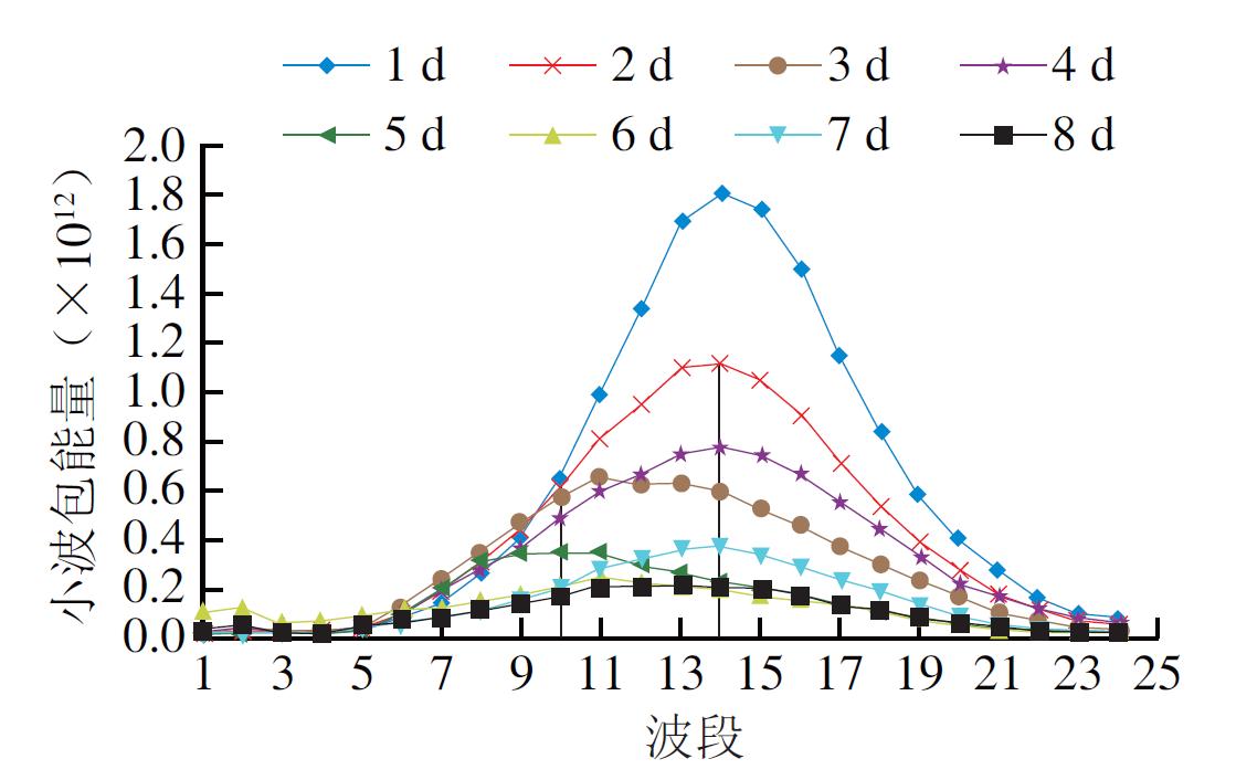 圖2 不同貯藏日特征激發(fā)波長下發(fā)射光譜波段對應(yīng)的小波包能量變化曲線(劃分尺度12 nm)