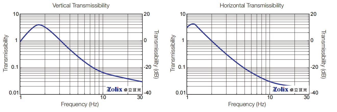 其中被動式氣浮隔振平臺TPR系列是卓立漢光獨立自主研發(fā)的三線擺氣浮平臺,其被動的固有頻率以及隔振效率如下: