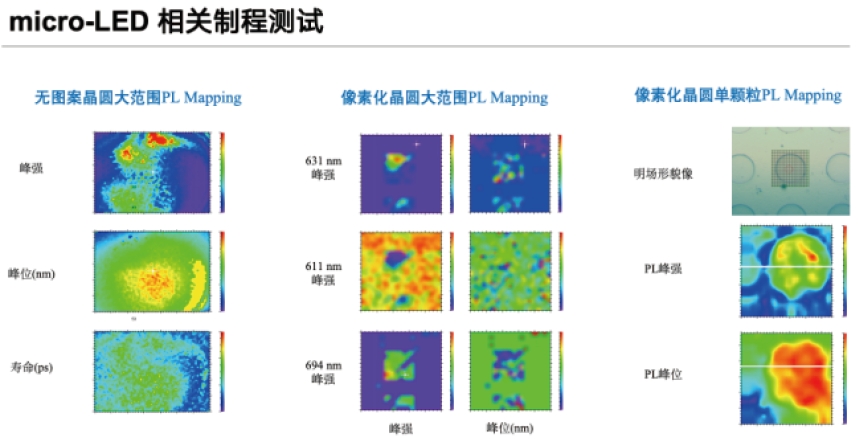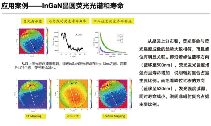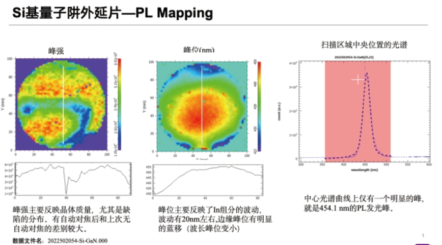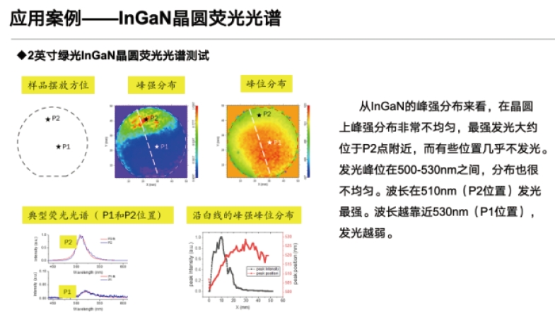 PL測(cè)試是一種無(wú)損的測(cè)試方法,可以快速、便捷地表征半導(dǎo)體材料的缺陷、雜質(zhì)以及材料的發(fā)光性能。其主要功能包括:1)組分測(cè)定;對(duì)三元或四元系合金,如InGaN等,通過(guò)PL 峰位確定半導(dǎo)體材料的禁帶寬度,進(jìn)而確定材料組分X;2)雜質(zhì)識(shí)別;通過(guò)光譜中的特征譜線位置,可以識(shí)別材料中的雜質(zhì)元素;3)雜質(zhì)濃度測(cè)定;4)半導(dǎo)體材料的少數(shù)載流子壽命測(cè)量;5)位錯(cuò)等缺陷的相關(guān)作用研究。