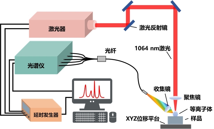 激光誘導擊穿光譜實驗是通過超短脈沖激光聚焦樣品表面形成等離子體,對等離子體發(fā)射光譜進行分析來確定樣品的物質成分及含量。超短脈沖激光聚焦后能量密度較高,可以將任何物態(tài)(固態(tài)、液態(tài)、氣態(tài))的樣品激發(fā)形成等離子體,LIBS技術(原則上)可以分析任何物態(tài)的樣品,僅受到激光的功率以及探測光譜儀的靈敏度和波長范圍的限制。幾乎所有的元素被激發(fā)形成等離子體后都會發(fā)出特征譜線,因此,LIBS可以分析大多數(shù)的元素。