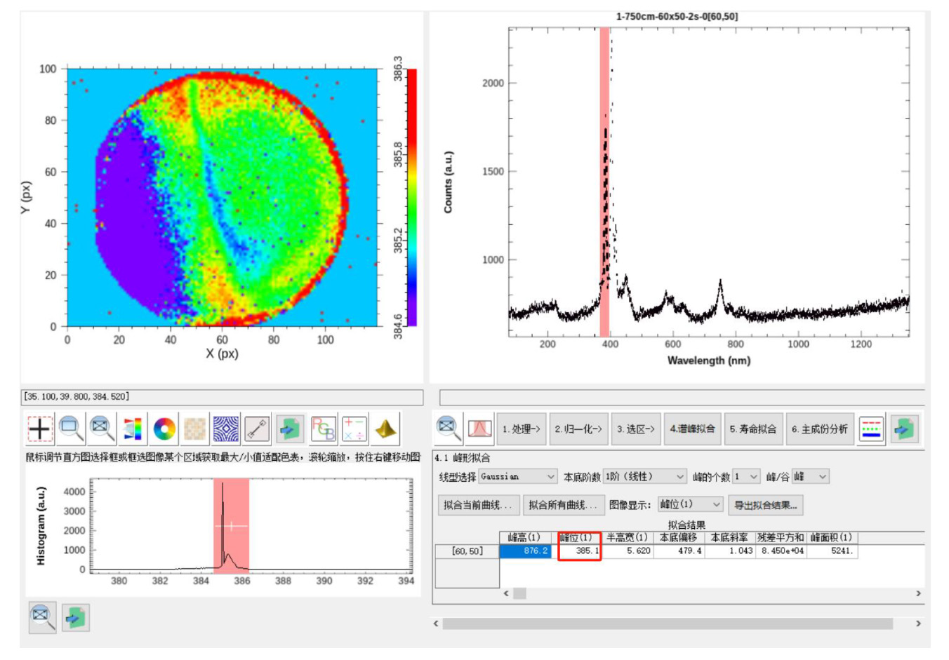 可對光譜峰位、峰高和半高寬等進行擬合??勺詣訑M合并計算應力、晶化率、載流子濃度等信息,樣品數據庫可定制。主成分分析(PCA)和k-均值聚類處理模塊。將擬合結果以二維圖像方式顯示。 |