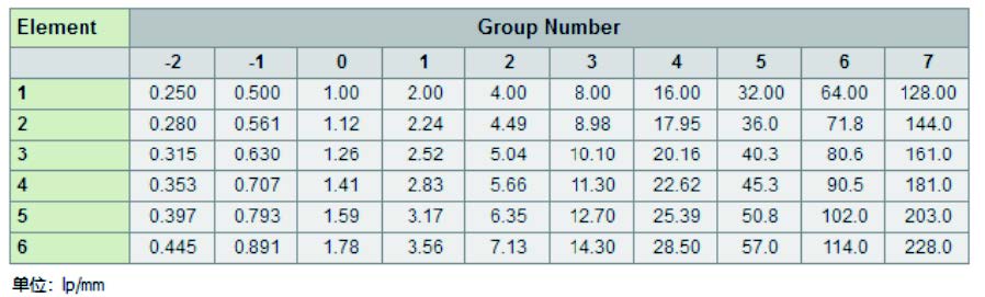 該套光學配置的理論分辨率為0.005mm,通過THORLABS的USAF1951標準分辨率板測試,如上圖中的右圖所示,能最小分辨的線對編號為右圖虛線框中的“6-3”對照如下1951 USAF測試靶的表格