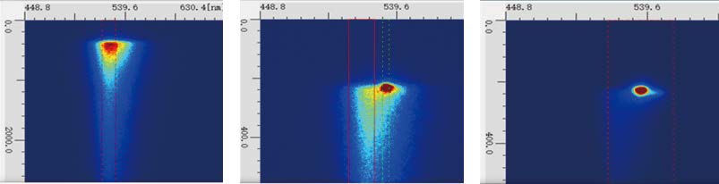 鈣鈦礦樣品中的放大自發(fā)輻射(Ampl i f i ed Spontaneous Emission,ASE)發(fā)光過(guò)程研究。條紋相機(jī)可以監(jiān)測(cè)到隨著激光功率逐漸增大,樣品從單純的熒光發(fā)射(左圖)變成熒光與ASE混合發(fā)光(中圖),最后到只有ASE發(fā)光(右圖)的全部過(guò)程。