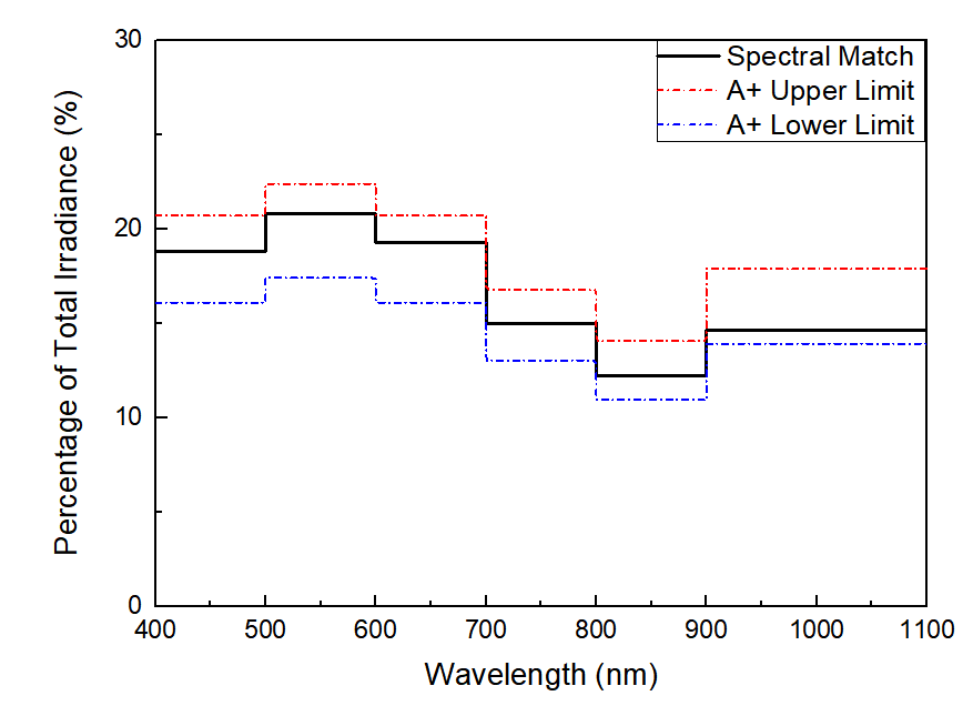 | 光譜匹配度 | 計算6個波段內(nèi)(400-500-600-700-800-900-1100nm) 的光譜輻照度占總波段的光譜輻照度百分比與標(biāo)準(zhǔn)光譜百分比的比例 | 0.75-1.25 | 0.6-1.4 | 0.4-2.0 |